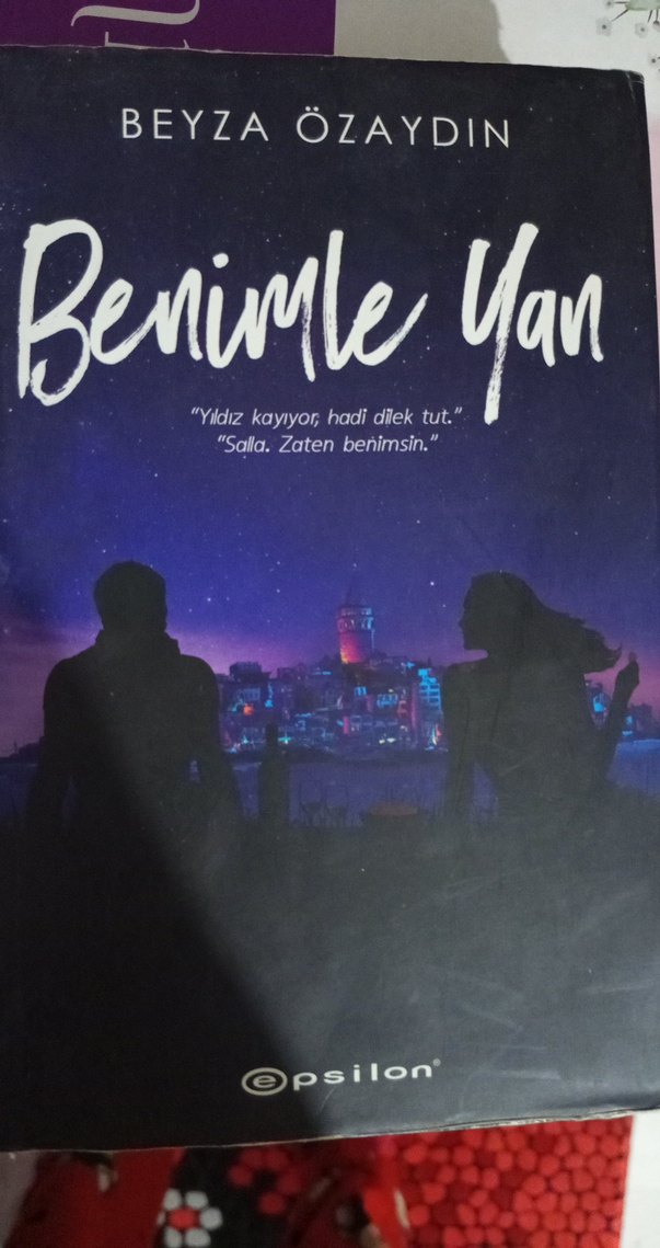 "Benimle Yan" adlı roman, gece manzaralı kapakta romantik temalar içeriyor. "Salla. Zaten benimsin." ve "Yıldız kayıyor, hadi dilek tut." sözleri yer alıyor.