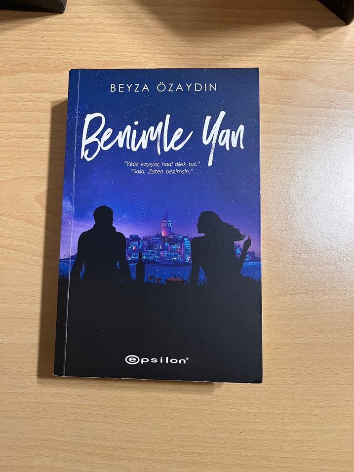 Beyza Özaydın'ın "Benimle Yan" adlı romanı, Epsilon yayınlarından. Kapakta, gün batımında şehir manzarası önünde iki siluet yer alıyor.