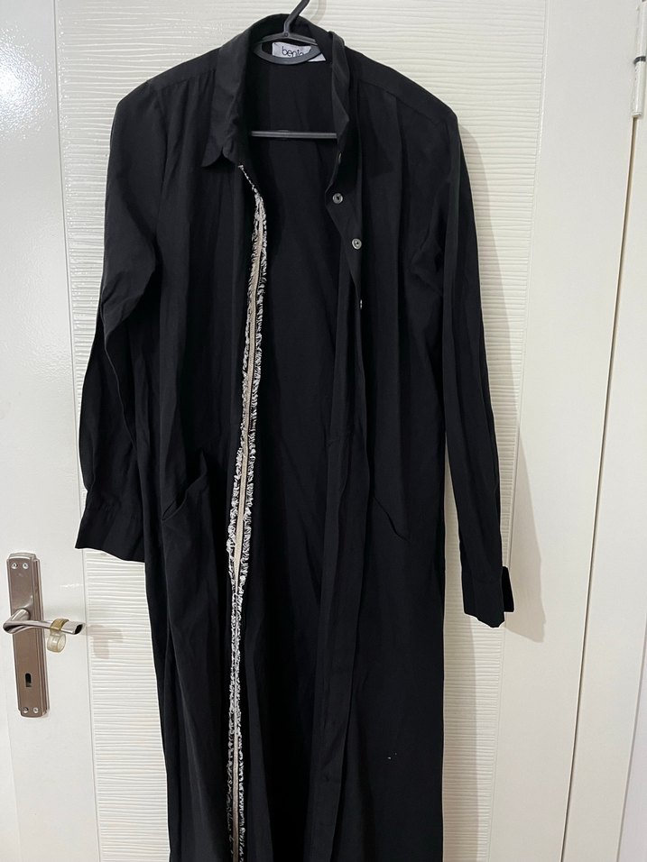 Siyah uzun hamile manto, satenimsi kumaş, drapeli tasarım ve kesik yaka içerir. Uzun kollu ve rahat kesim, günlük sokak modasına uygun. Sadece bir kere giydim hem elbise hem de giyicik olarak kullanılabilir boydan düğmelidir cepleri geniştir