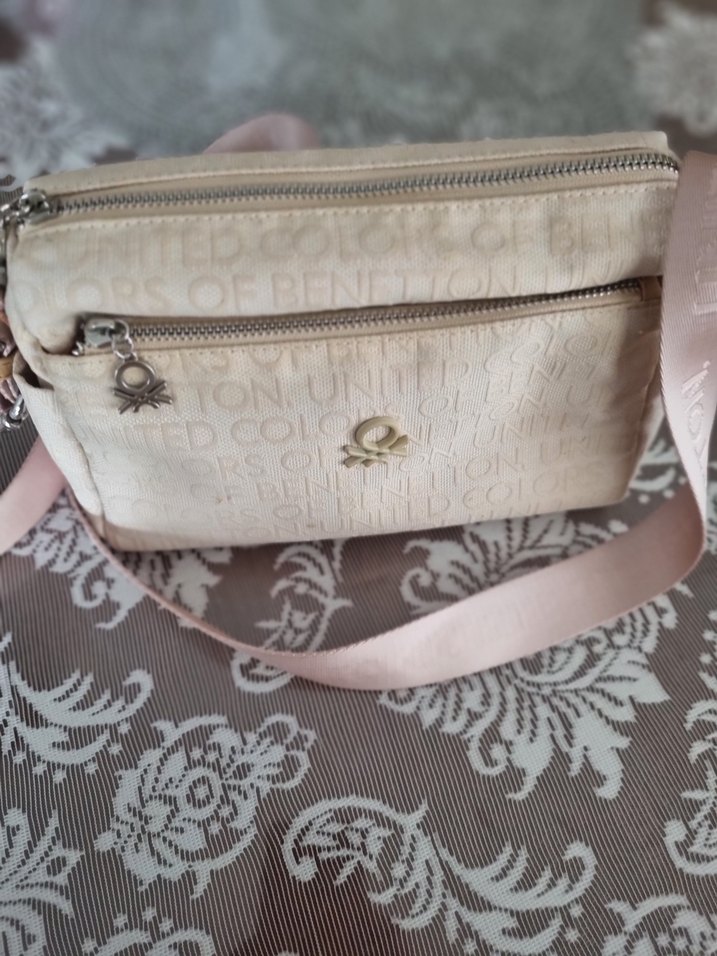 Benetton orjinal, Sentetik kumaştan, baskılı desenli ve tokalı bej çapraz çanta. Günlük kullanım için uygun, trend sokak stiliyle uyumlu.