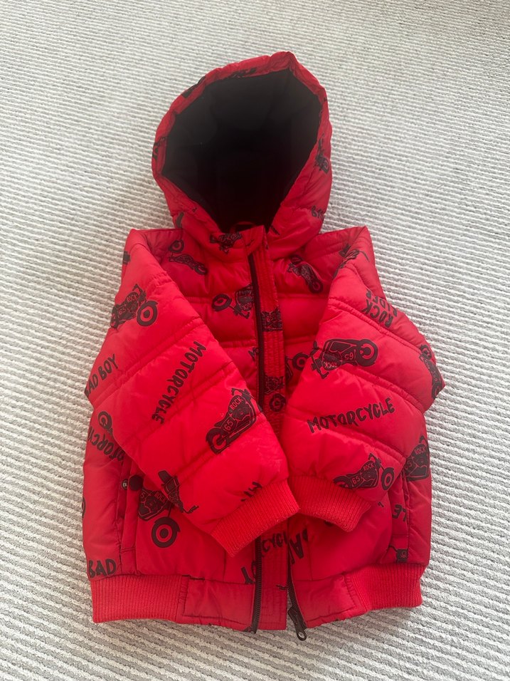Kapüşonlu ve fermuarlı, renkli motor baskılı kırmızı, yumuşak ve sıcak kumaştan erkek biker montu. ️ Hic giyilmedi herhangi bir kusuru yok