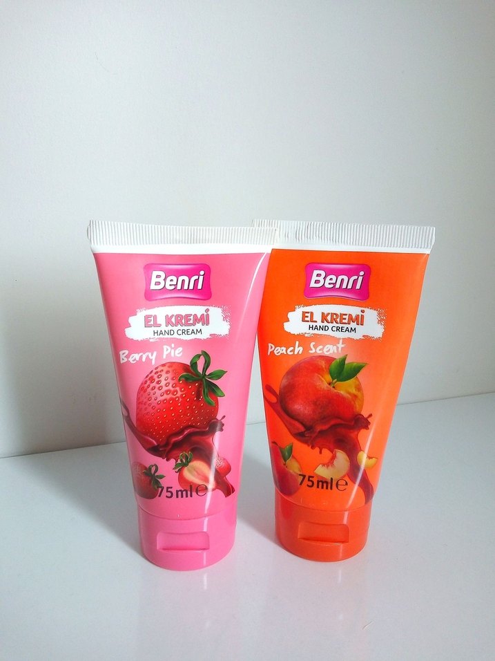 Benri el kremleri Berry Pie ve Şeftali kokularında, 75 ml tüplerde. Nemlendirici bakım ve hoş meyvemsi kokular sunar.
