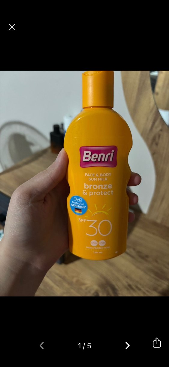 Benri SPF 30 yüz ve vücut güneş sütü, bronzlaşma ve koruma sağlar. Almanya'da üretilmiş UVA filtresi içerir. ☀️