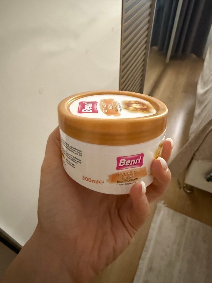 Benri vücut kremi, 300 ml kutuda cildi nemlendirmek için bakım sağlar.