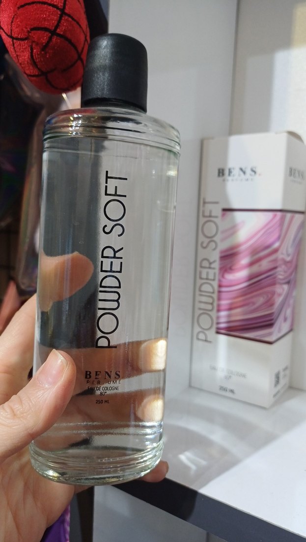 BENS Powder Soft kolonyası, 250ml şeffaf şişede, siyah kapaklı. Kokusu yumuşak ve pastel bej tonunda.