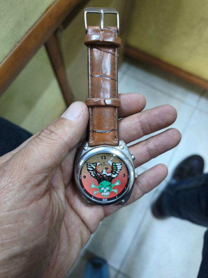 İCERİSİNDE ISIKLARI YANAR KURU KAFA VE 12 3 6 9 Dugmeye bastiginizda çok güzel renk verir kaliteli bir saattir ve eski model tarzında Vintage tarzda, renkli grafik desenli kadranı olan erkek kol saati. Kahverengi deri kayışla klasik bir görünüm sunar. ⌚