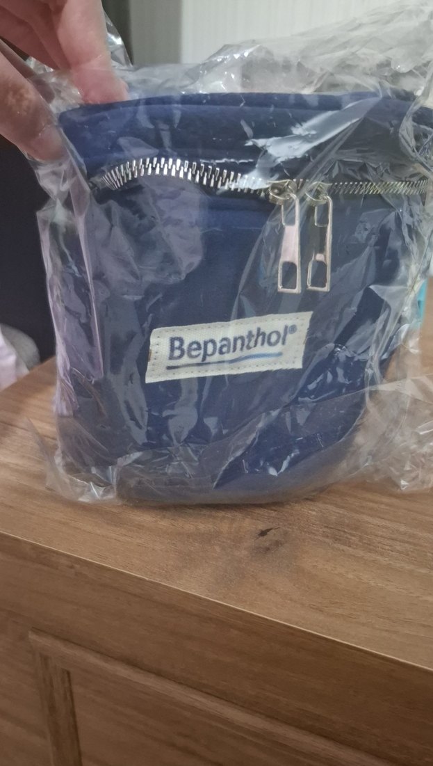 Bepanthol markalı, fermuarlı mavi kadife kumaştan makyaj çantası. ihtiyaç fazlası