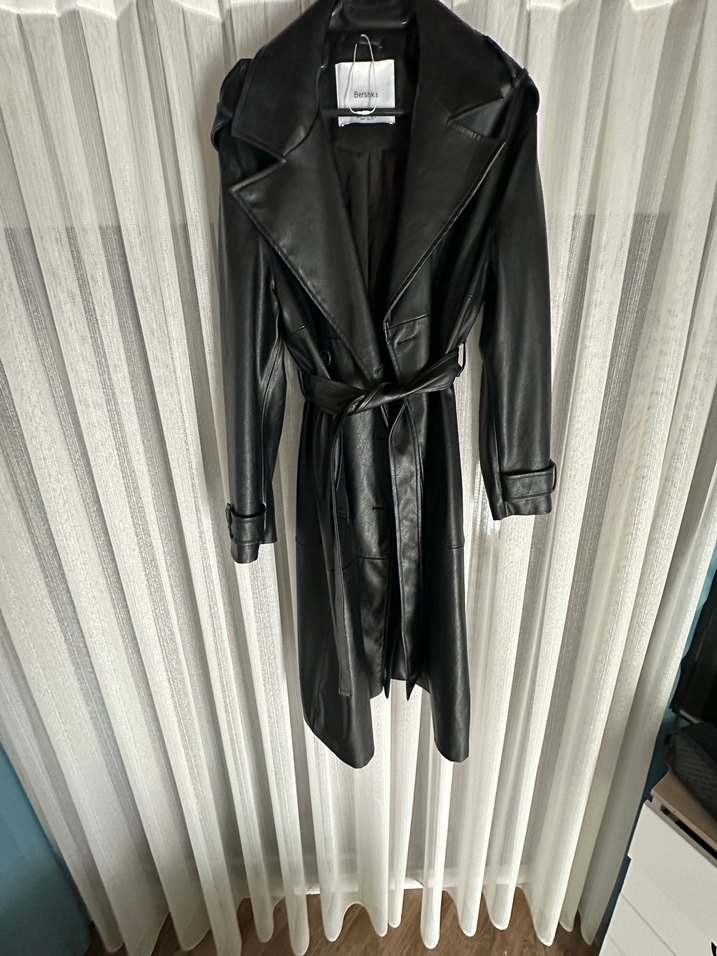 Bershka Siyah Deri Kemerli Uzun Trençkot