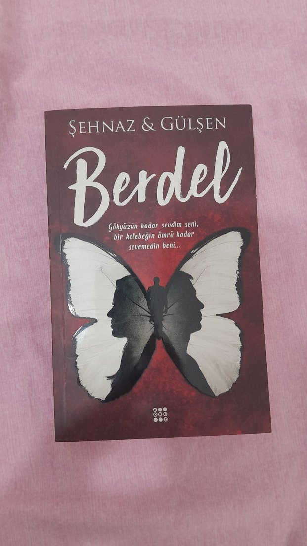 Şehnaz & Gülşen'in "Berdel" adlı romanı, kelebek kapak tasarımıyla aşk ve kader temalarını işliyor. İlk sayfasında sadece tarih var.