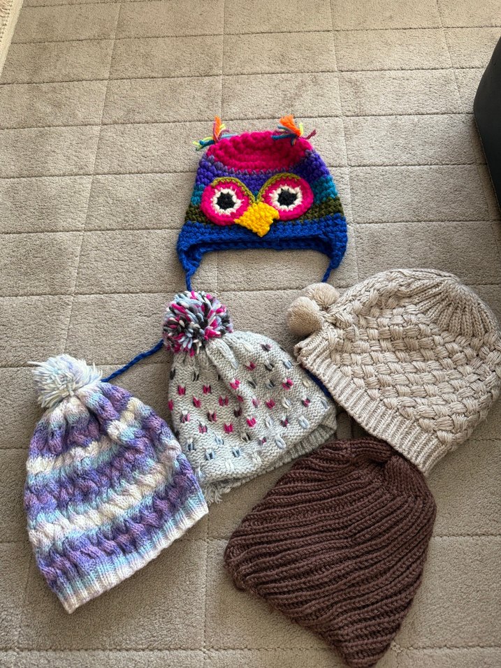 Renkli nakışlı desenlere sahip örgü bereleri. Yumuşak örgü kumaştan yapılmış bohem tarzda çeşitli canlı ve rahat şapkalar seti. TANESİ 150 TL