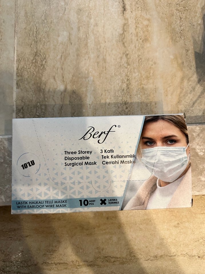 Berf 3 katlı tek kullanımlık cerrahi maske, lastik halkalı ve lateks içermez. Pakette 9 adet maske bulunmaktadır.