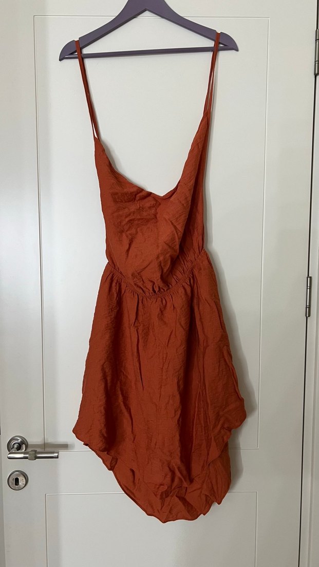 Asimetrik eteği ve degaje yaka kumaşı yazlık güzel bir kumaş bir kaç kere giydim arkadaki ip kısmında plastik halkalar vardı o kopunca ipinden kendim tadilat yaptım fotoğrafta detayı var
