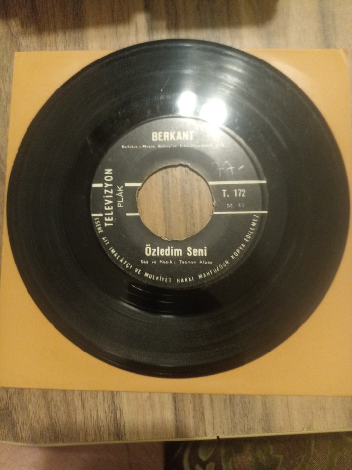 Berkant'ın "Özledim Seni" adlı şarkısını içeren T.172 katalog numaralı 45'lik plak. Televison etiketiyle basılmıştır.