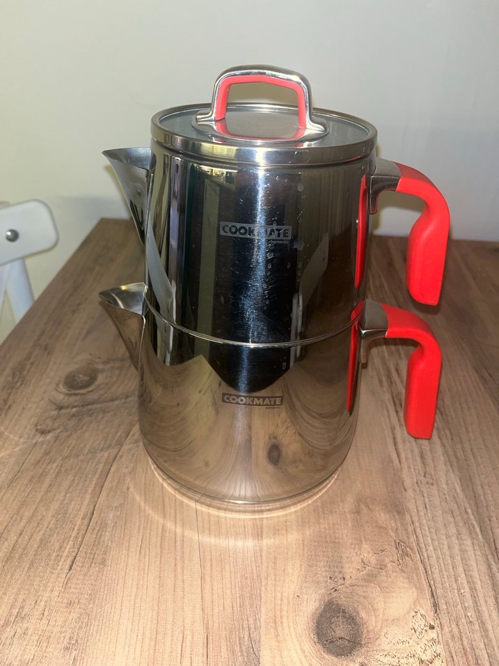 Paslanmaz çelikten üretilmiş, kırmızı sap ve kapak kulpları bulunan iki parçalı çaydanlıktır. Dayanıklı ve modern görünüme sahiptir. Bernardodan alınmıstır sayılı kullanıldı elektirikli çaydanlığa geçiş yapıldı için kullanmadım