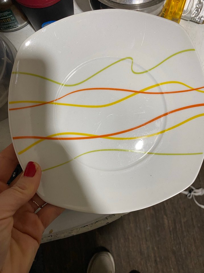Beyaz yemek tabağı üzerinde turuncu, sarı ve yeşil renkli dalgalı çizgiler bulunur. Hafif ve sade tasarıma sahiptir. ️19 cm çapı