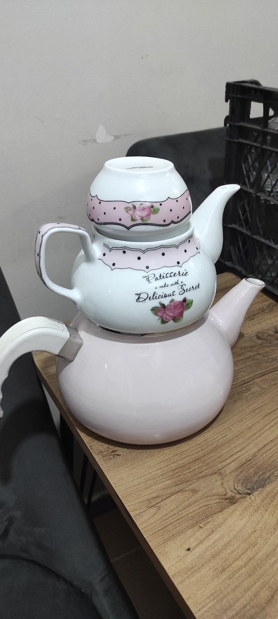 Pastel beyaz porselen çaydanlık, üzerinde çiçekli ve puantiyeli pembe desenler ile "Paticcerie" yazısı bulunur. İki parçalı klasik tasarıma sahiptir.