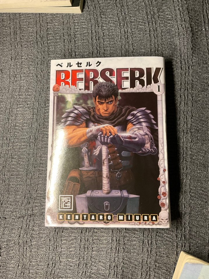 Kentaro Miura'nın BERSERK serisinin 1. cildi. Zırhlı ana karakterin kılıcını tuttuğu detaylı çizimlerle karanlık bir fantezi hikayesi anlatılıyor.