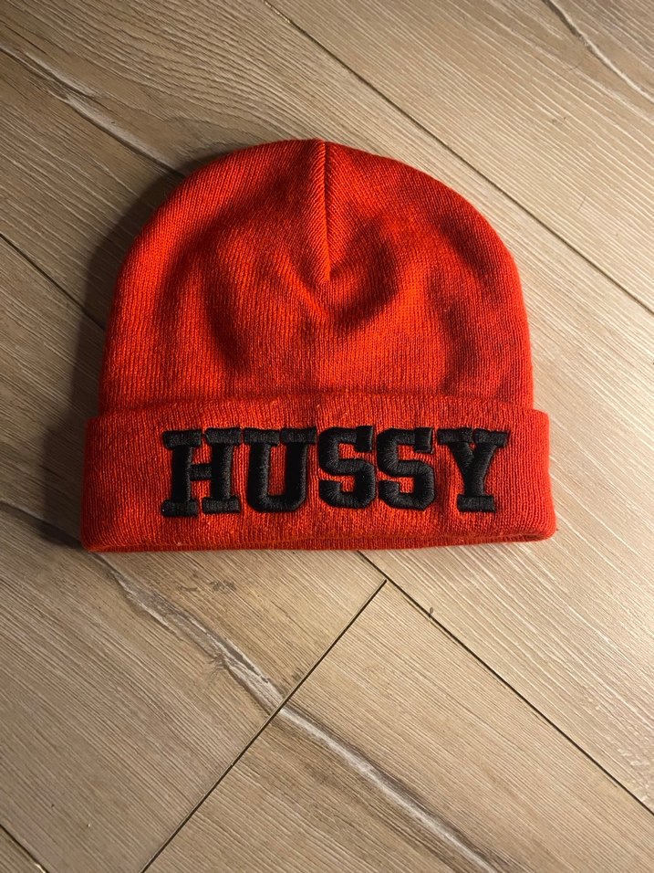 Kırmızı renkli, örgü ve fleece astarlı bere. Önünde "HUSSY" nakış detayı bulunan, bohem ve retro tarza uygun rahat bir aksesuar.