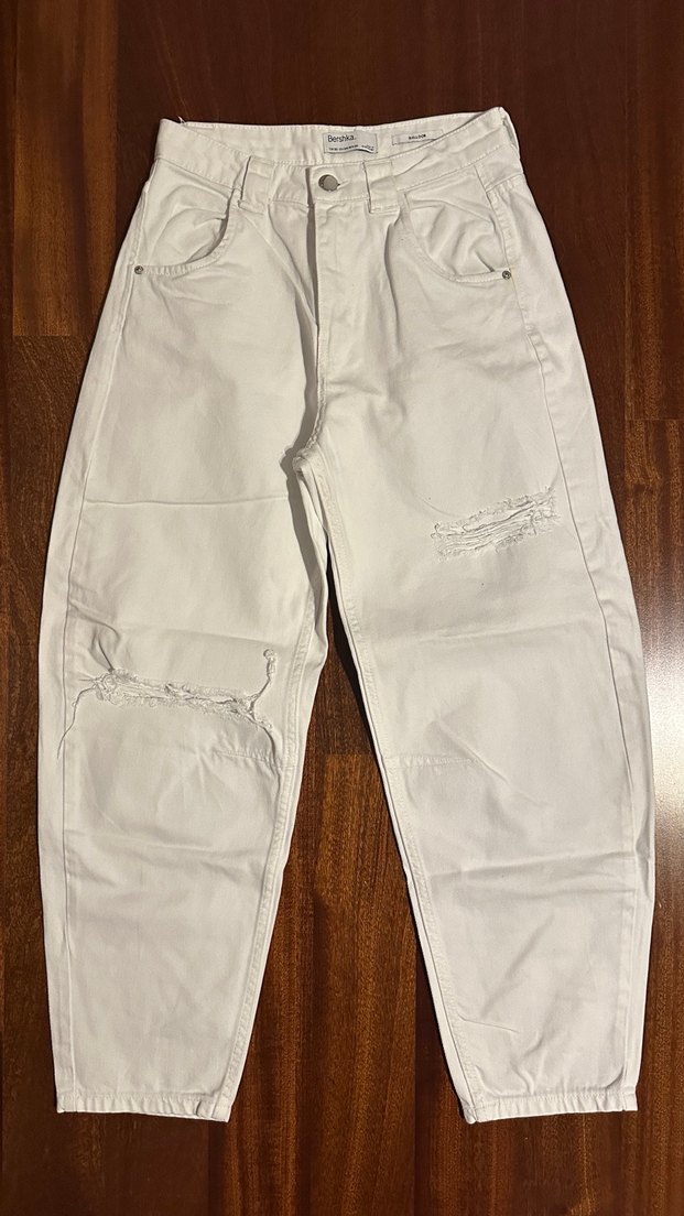 Balon kesim, orta bel, beyaz denim kumaş, kadın jean. Sol diz kapağının biraz üstünde ve sağ diz kapağında yırtık detayları bulunur.