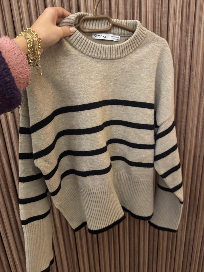 Bej renkli, çizgili örgü kadın kazak, yuvarlak yaka ve uzun kollu, bol kesim rahat bir modeldir. Bedeni xs