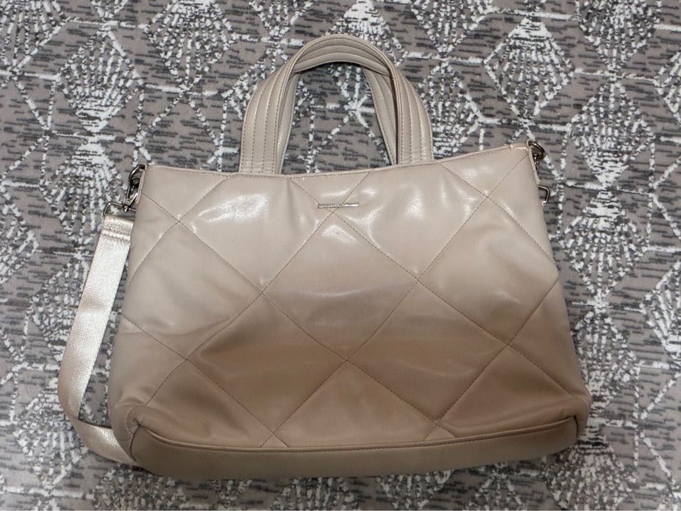 Bej renkli deri kadın çanta, kapitone desenli ve fermuarlı, günlük kullanıma uygun çağdaş tarzda. Kusurları fotoğraflarda mevcuttur