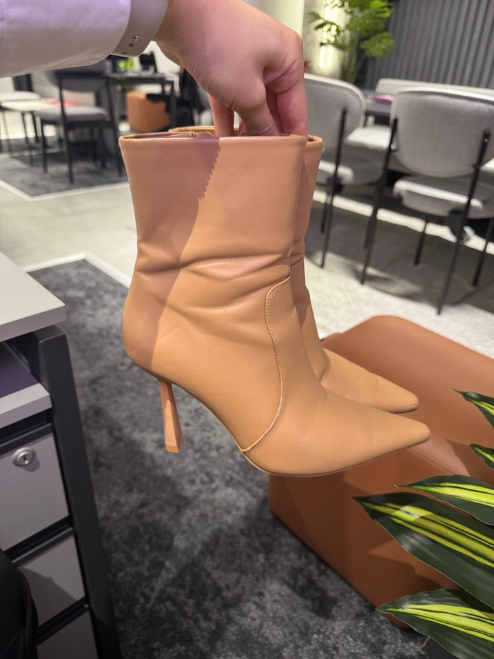 Bej deri, stiletto topuklu kadın bot. Bağcıklı tasarımı ve pastel tonlarıyla ofis için uygun, çağdaş bir stil sunar. Ofiste 2 3 defa giydim