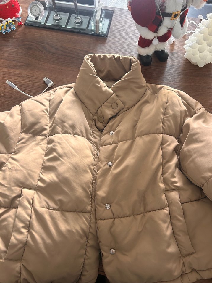 Bej, parlak sentetik kumaştan üretilmiş, düğmeli ve kesik yaka detaylı kadın kışlık midi mont. Salaş kesimi ve uzun kollu, rahat sokak stili için uygundur. ❄️