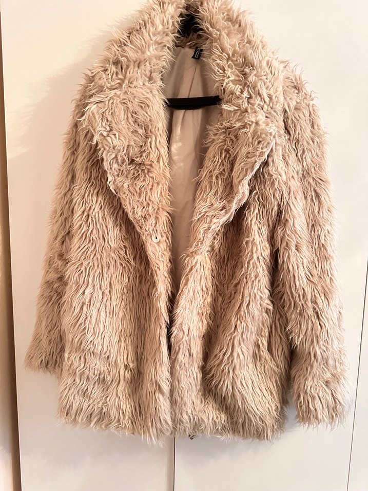 Bej midi uzunlukta suni kürk ceket, kesik yaka ve uzun kolludur. Rahat kesimi ve yumuşak sentetik kumaşıyla günlük kullanıma uygundur.