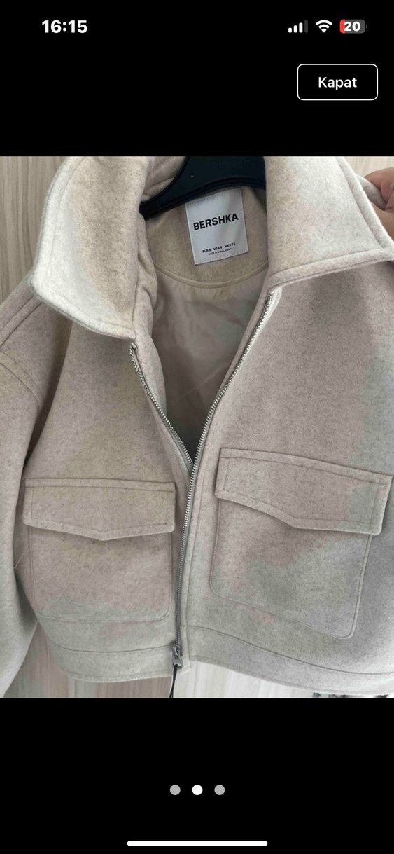 Bershka markalı, bej renk kısa kesim kadın kaban. Uzun kollu, bisiklet yakalı ve kürk detaylı, rahat kesim ve yumuşak kumaşlıdır.