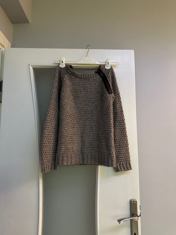 Bej renkli örgü kadın kazak, yuvarlak yakalı, uzun kollu, bol kesim ve kısa boyda, gündelik kullanıma uygun sade ve rahat tarzda.