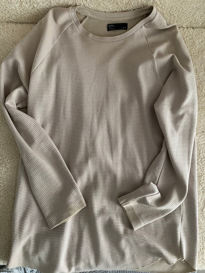 Bej renkli, uzun kollu, yuvarlak yaka ve bol kesim sweatshirt. Yumuşak keten kumaştan üretilmiş, gündelik kullanım için rahat ve sade bir tasarım sunar. Genişlik (iki koltuk altı arası mesafe) 54, uzunluk 76 cm