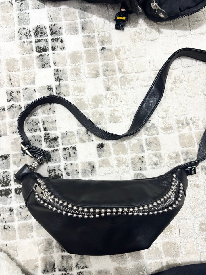 Gümüş renkli zımbalarla süslenmiş, bel detaylı siyah deri rock punk tarzı çanta. Günlük kullanıma uygun, nakış detaylı.