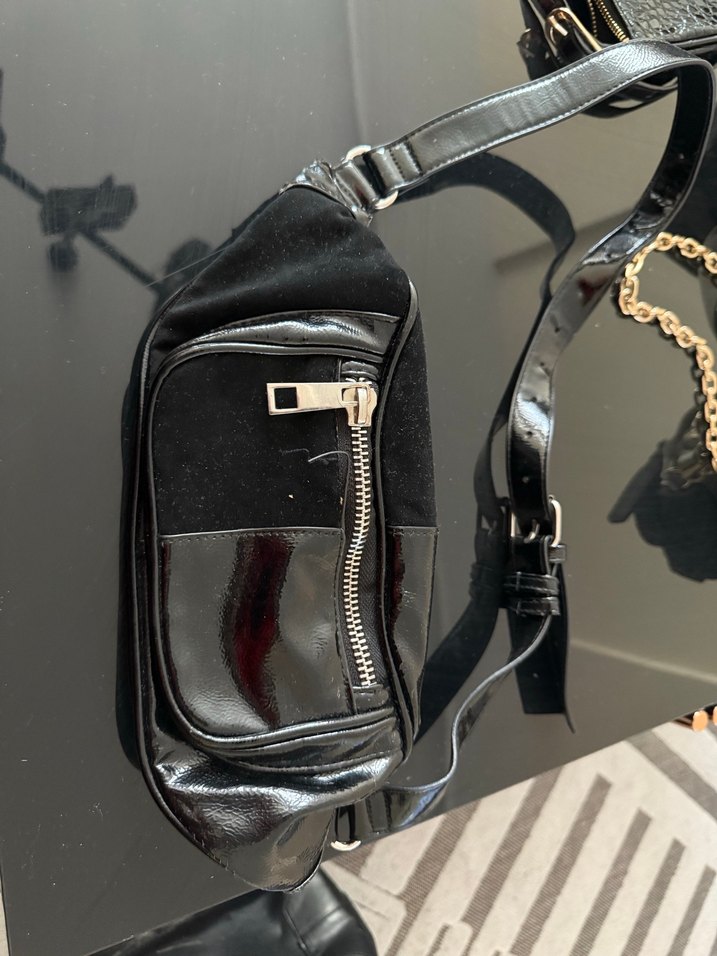 Siyah deri, tokalı kayış ve fermuarlı ön cepli goth tarzı kadın omuz çantası, günlük kullanım için uygundur.