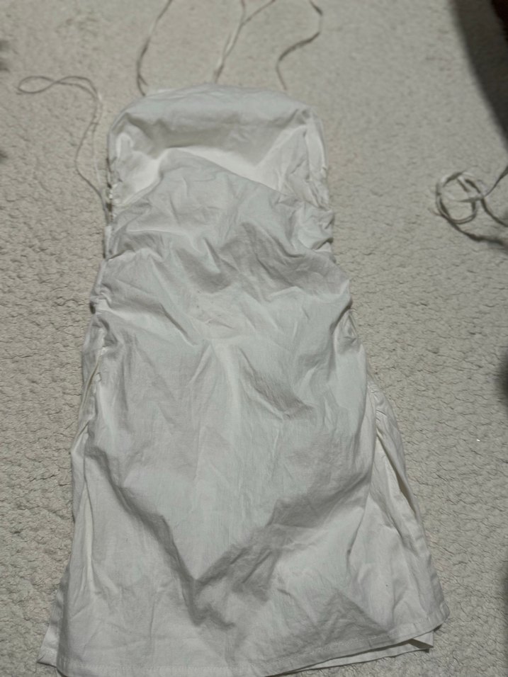 Bershka beyaz renkli, ince askılı ve desensiz düz yazlık elbisedir. Hafif az kullanıldı.Arkası açık ip bağlamalı model
