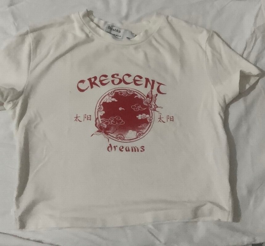 Bershka beyaz pamuk tişört, kırmızı baskılı deseni ve yazı ile. kısa kollu ve yuvarlak yaka, sokak stili için uygun.
