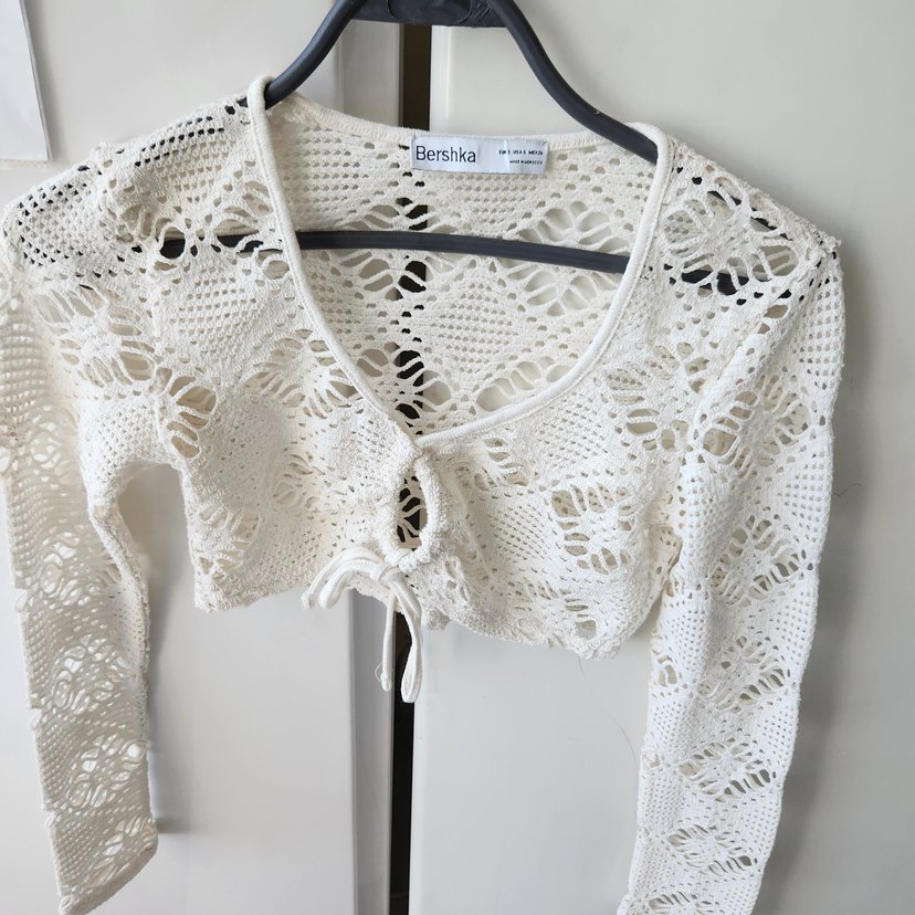 Bershka marka, beyaz renk, nakışlı bohem desenli, uzun kollu, V yaka, örgü kumaştan yapılmış, normal boyda, vücuda oturan kazak.