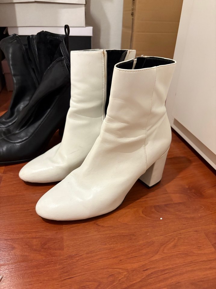 Beyaz deri kadın bot, blok topuklu ve desen içermeyen minimalist tasarıma sahip. Trendy ve rahat sokak stiline uygun. Önünde ufak hasarı var