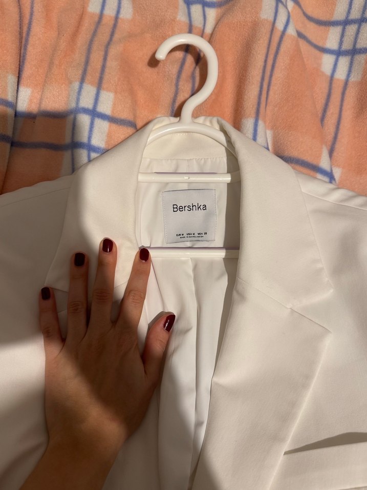 Bershka marka, düğmeli, yakalı, baskılı desenli, sentetik kumaştan, normal boy, dar kesim beyaz kadın blazer. Strappy kollu, iş ve sokak stili arasında.