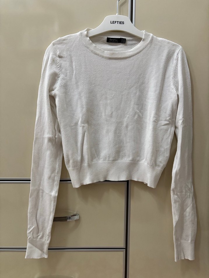 Fitted kesim beyaz pamuklu kazak, yuvarlak yaka ve uzun kollu. Minimalist ve sade tarzda, günlük sokak stili için uygundur.