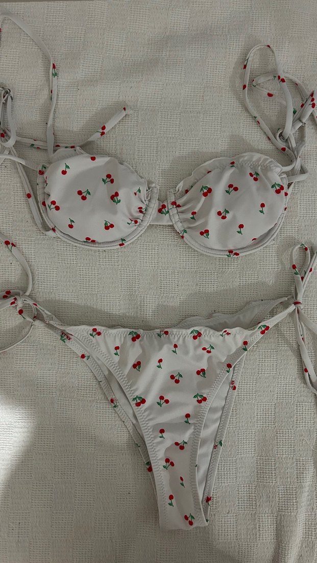 bershka kiraz desenli beyaz bikini altı m üstü s bedendir , askılı ve vücuda oturan kesime sahip.