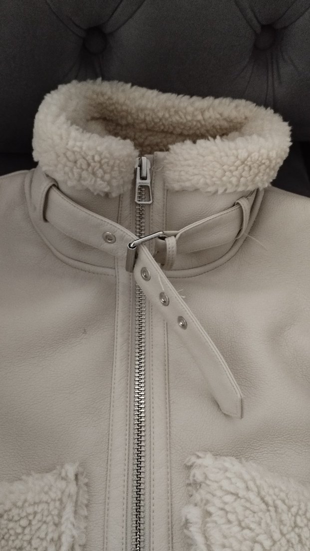 Beyaz renkli, fitted kesim Bershka ceket; kürklü detaylara, yakaya ve askılı kollara sahip. Yumuşak, sıcak kumaştan, rahat sokak stili için uygun.