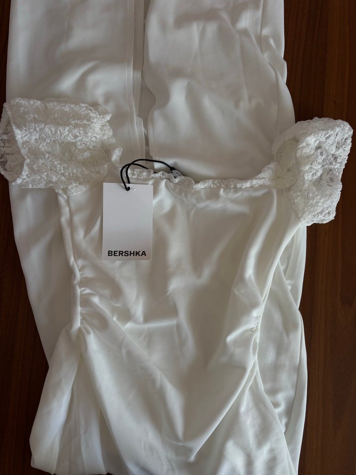 Bershka'dan beyaz, straplez yaka ve kısa dantelli kollara sahip, parlak kumaşlı mini elbise. Bohem tarz için uygun.