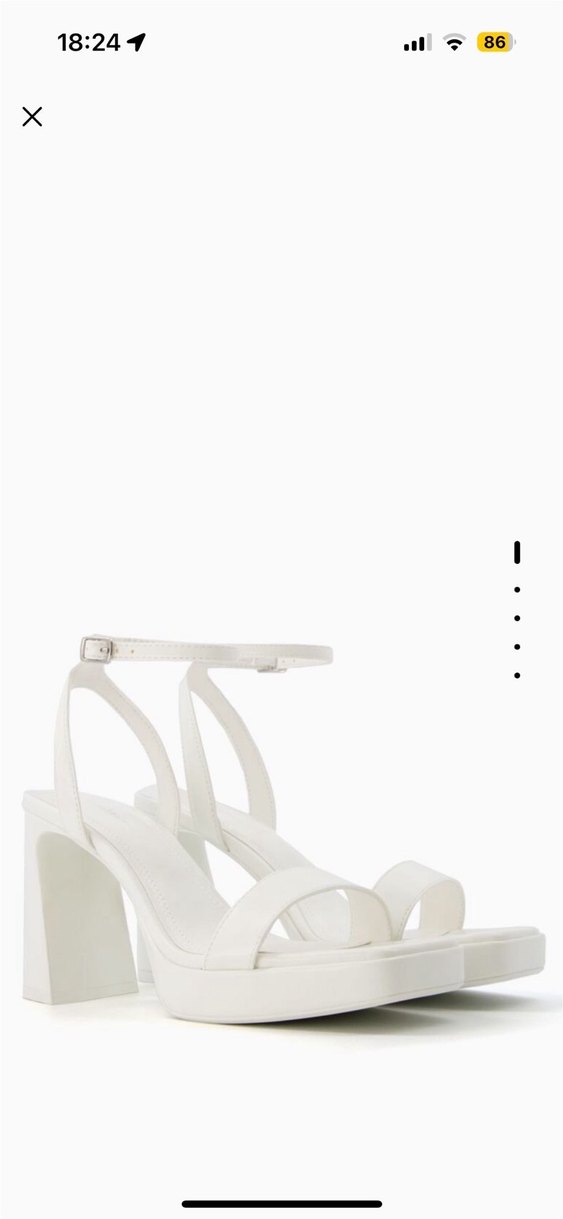Beyaz, tokalı bantlı platform topuklu sandalet. Minimalist ve çağdaş tasarımıyla romantik akşamlar için uygundur. Ürün yalnızca bir kez giyildi.Topuk:9cm / alt platform:2cm alıcısına şimdiden hayırlı olsun. İade yoktur.