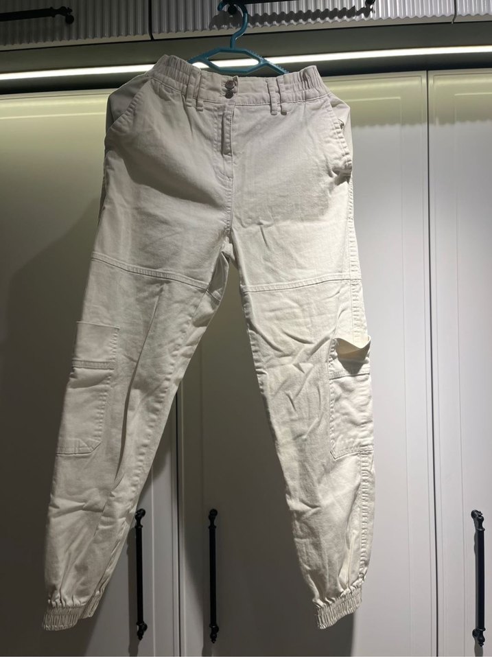 Midi boy, paçaları lastikli bol kesim beyaz keten pantolon. Rahat ve şık, dış mekan kullanımı için uygun. Nefes alan kumaş yapısı ile konforlu.