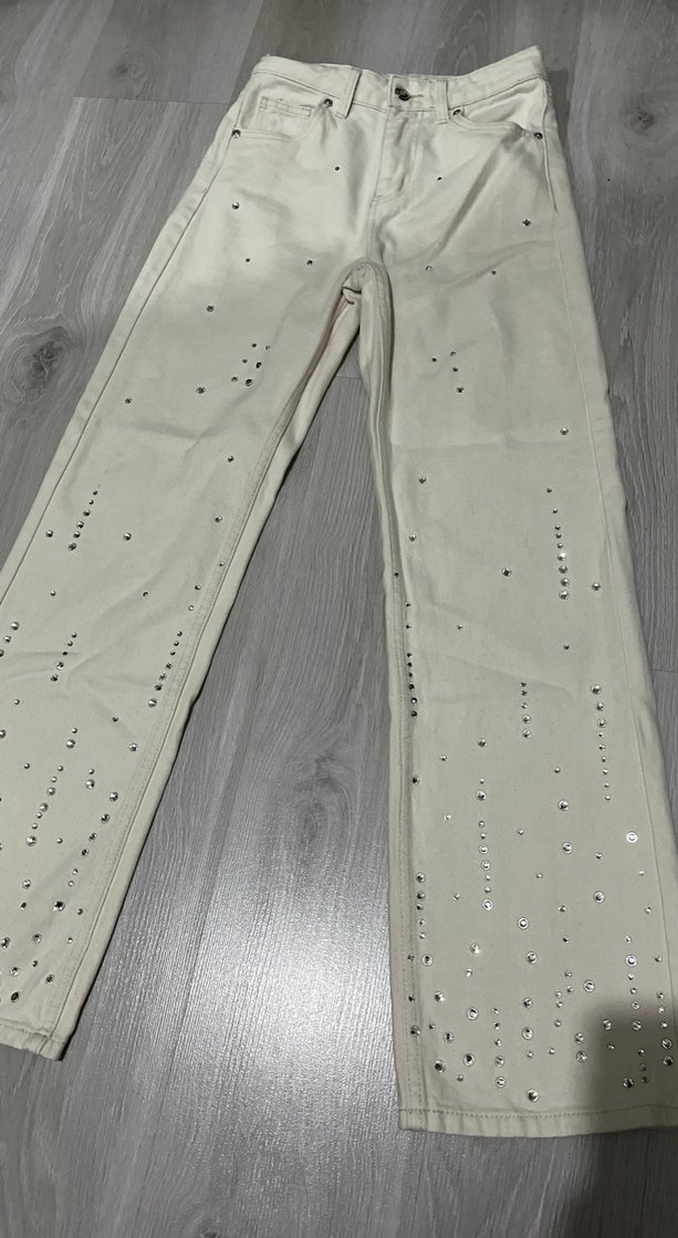 Görselde gözüktüğü gibi bir kaç taşı düştü. Kalıbı efsane güzel çok havalı bi pantolon. İç göstermiyor kalın bi kumaşı