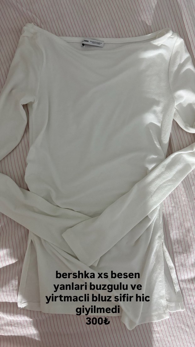 Bershka marka beyaz uzun kollu, yanları büzgülü ve yırtmaçlı, pamuklu kumaştan, XS beden bluz. Sıfır, hiç kullanılmamış.