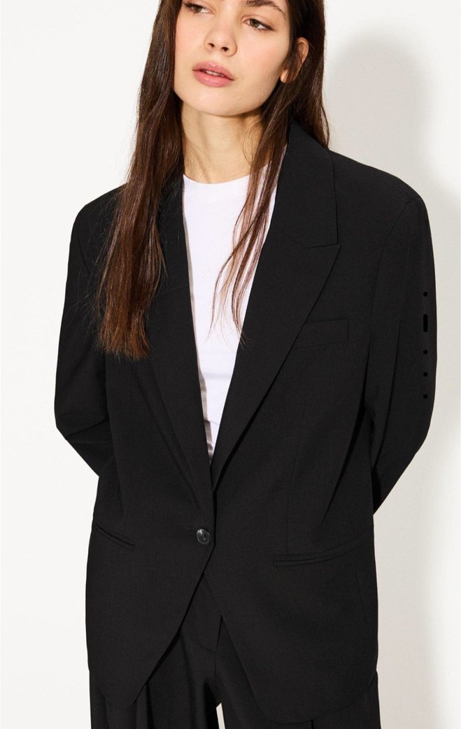 Siyah, notch yaka, uzun kollu kadın blazer. Normal kesim ve ipeksi kumaştan, ofis için şık ve rahat bir tercih.