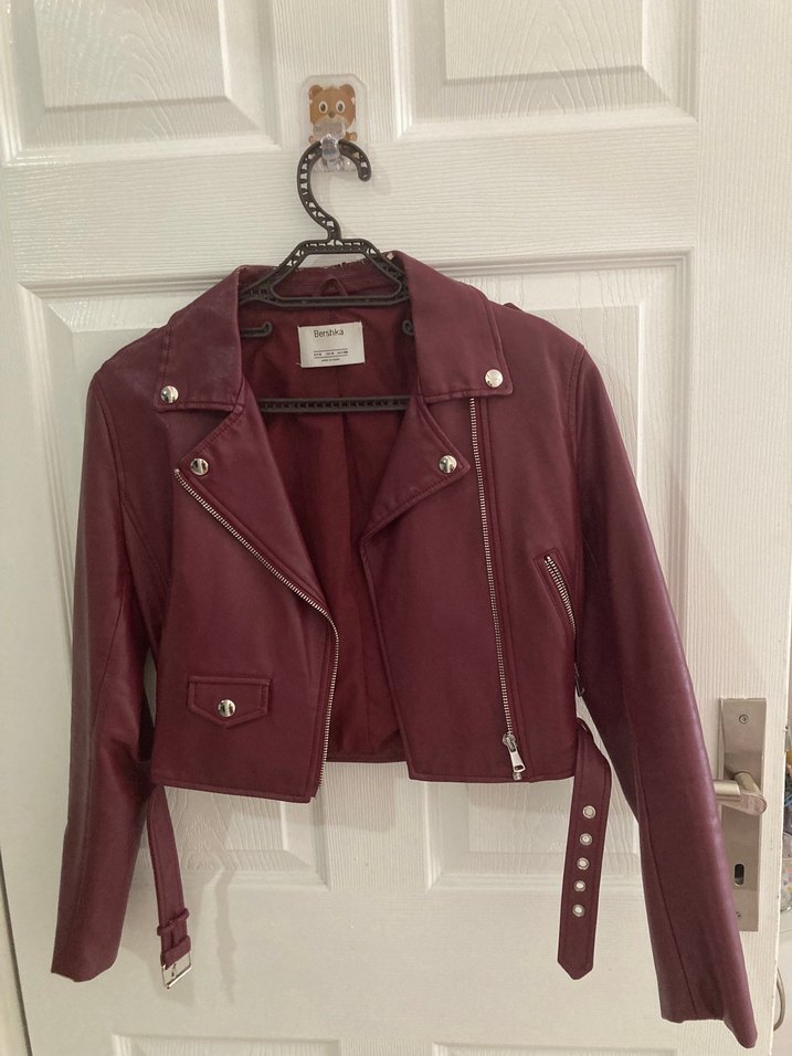 Bordo renk, kemerli ve kesimli deri biker ceket, çıtçıtlı yaka ve askılı kollara sahip, günlük kullanıma uygun parlak ve minimalist tarzda. Yaka kısmında deformasyon mevcut fakat dışından belli olmuyor. Arka fotoğrafından görebilirsiniz.