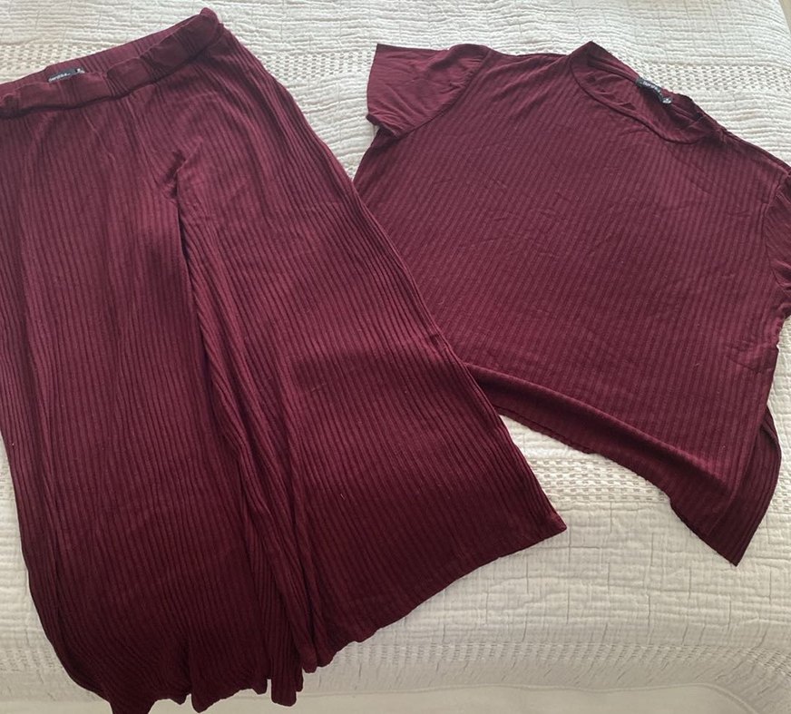 Bordo renk, midi boy, kısa kollu günlük takım. Balıkçı yaka ve rahat, esnek dokusu ile konfor sağlar.