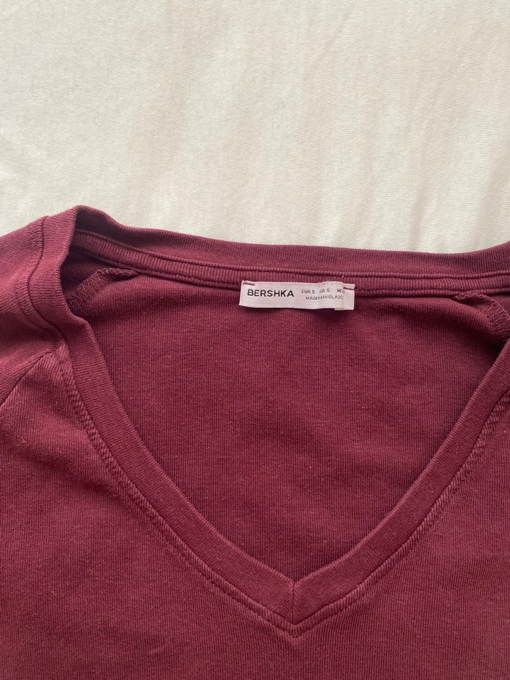 Bershka markasına ait, bordo renkli, V yaka ve uzun kollu, crop boyda, sade ve şık kadın kazak.
